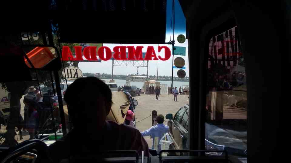 จากท่าข้ามแม่น้ำด้วยเรือเฟอรี่ที่สวายเรียง ระยะทาง 50 กม.ใช้เวลาเกือบ 2 ชม. เพราะถนนมีแค่ 2 เลน ก่อนถึงด่านชายแดนแวะพัก 20 นาที ที่นั่นมีร้านอาหาร ห้องน้ำและที่รับแลกเงิน เมื่อออกจากร้านอาหารจึงเห็นบ่อนคาสิโนโอ่อ่าอลังการ เมื่อถึงด่านบาวเวิ้ดของกัมพูชา ผู้โดยสารก็เดินลงรถข้ามด่าน ในขณะที่เด็กรถเอาพาสปอร์ตไปประทับตราพอรถผ่านด่านได้ก็ขึ้นรถอีกครั้ง เมื่อถึงด่านหม็อกบายของเวียตนาม ทุกคนต้องเอาสัมภาระติดตัวไปเข้าเครื่องสแกน จนท.เรียกชื่อตามพาสปอร์ตทีละคน ต้องเอียงคอ เงี่ยหูฟัง จนคอเคล็ด เพราะสำเนียงภาษาอังกฤษของเวียดนามฟังไม่เหมือนชื่อเราเลย