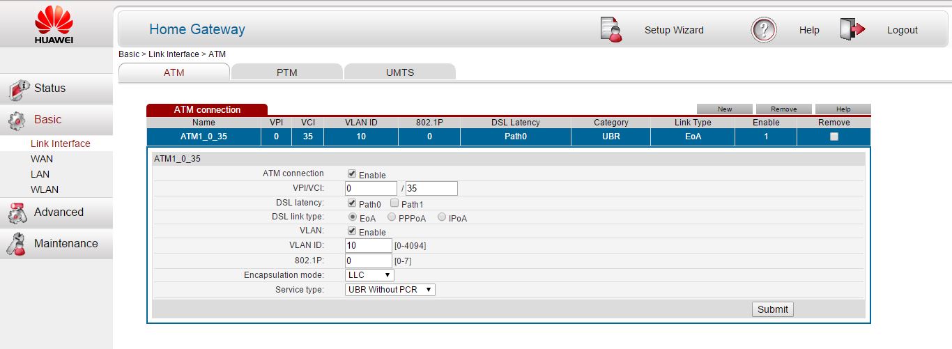 2. ไปที่ Basic -> Link Interface tab ATM และ config ตามภาพที่ 1 และกด Submit