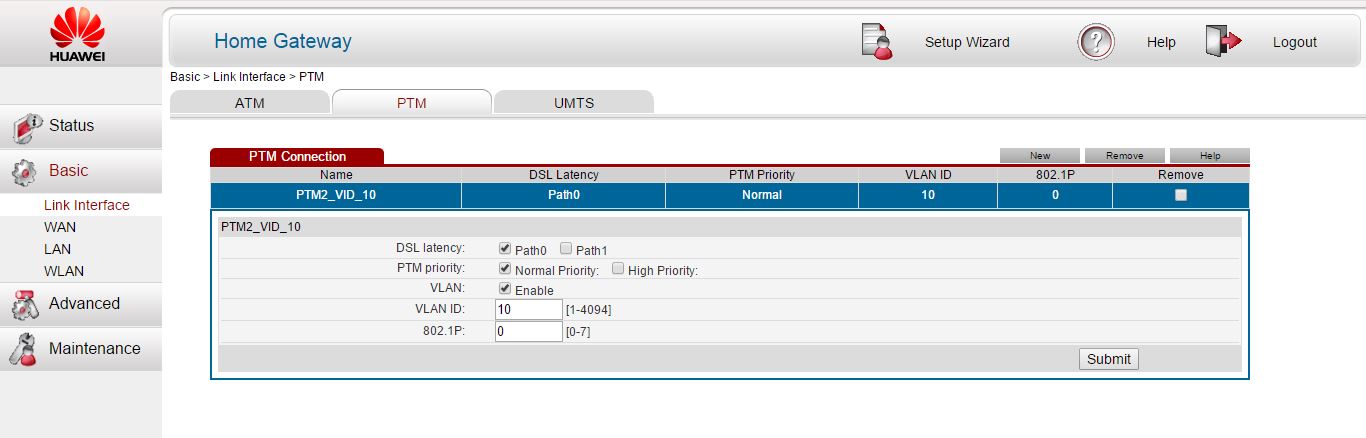3. ไปที่ Basic -> Link Interface tab PTM และ config ตามภาพที่ 2 และกด Submit
