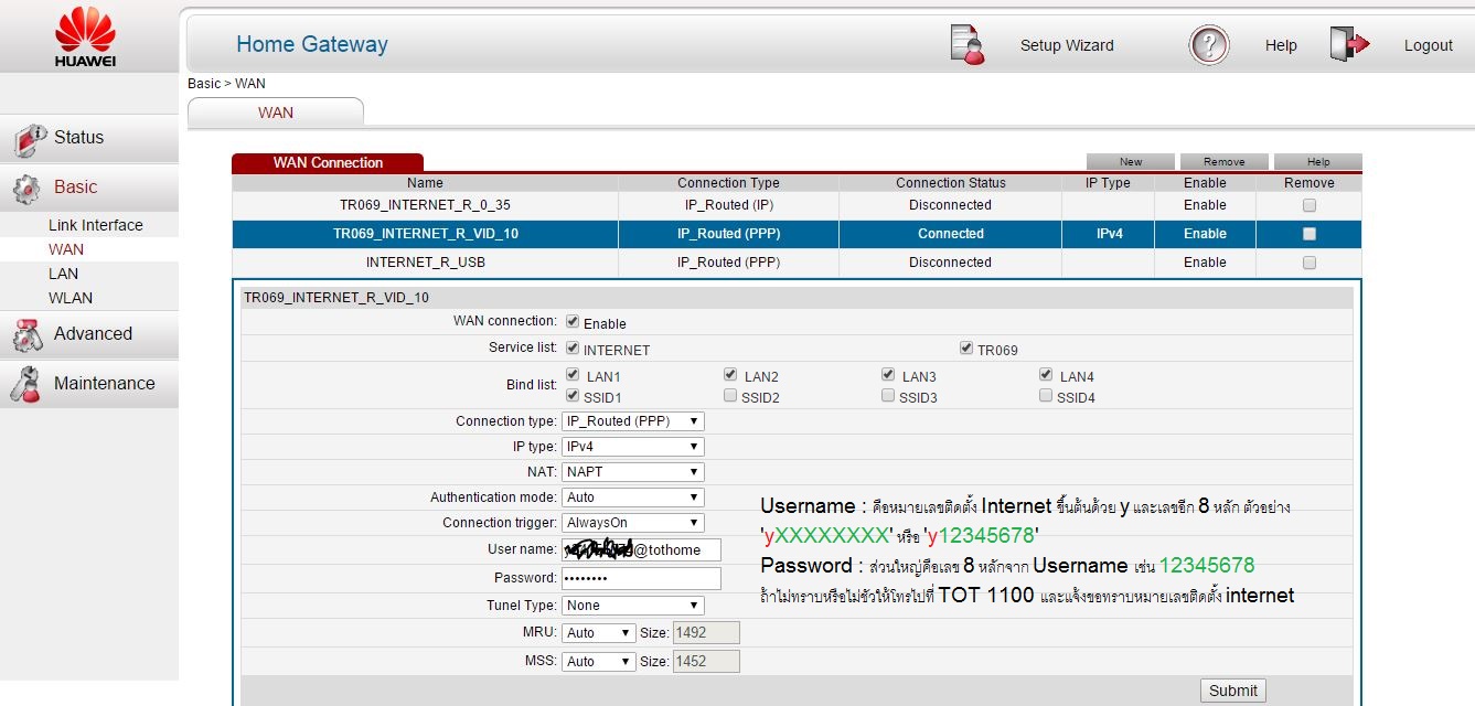 4. ไปที่ Basic -> WAN tab WAN คลิกซ้ายเลือก TR069_INTERNET_R_VID_10 และ config ตามภาพที่ 3 และกด Submit