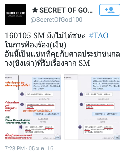 Source: http://www.koreaboo.com/news/chinese-media-reports-rumors-exo-ms-tao-leaving-sm-entertainment/ มีข่าวแพร่ออกมาจาก Weibo (สื่อออนไลน์ของจีน) ว่า Tao สมาชิกคนจีนใน EXO จะออกจาก SM Entertainment