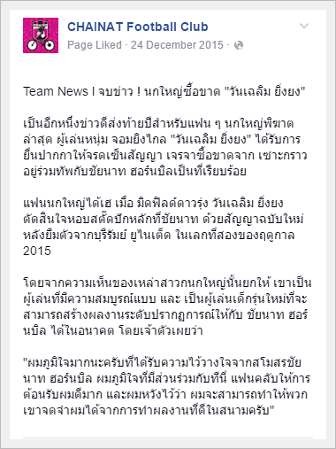 "วันเฉลิม ยิ่งยง" ที่บุรีรัมย์ปล่อยให้ยืมตัวในเลกสอง และทำผลงานได้ดีกับชัยนาท ฮอร์นบิล ทำให้ชัยนาทตัดสินใจซื้อขาด ปี 2016 อยู่ด้วยกันแน่นอน