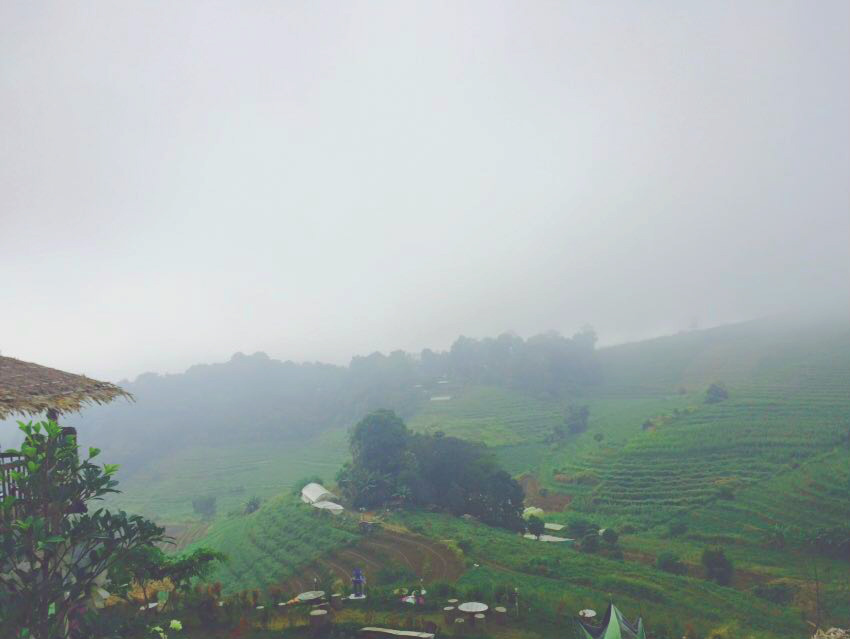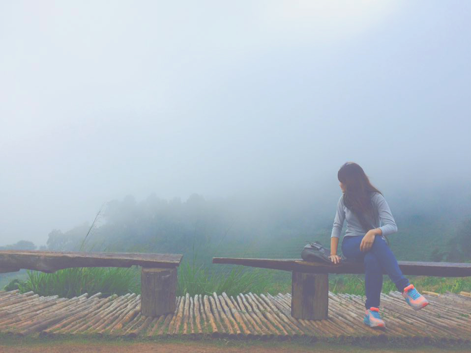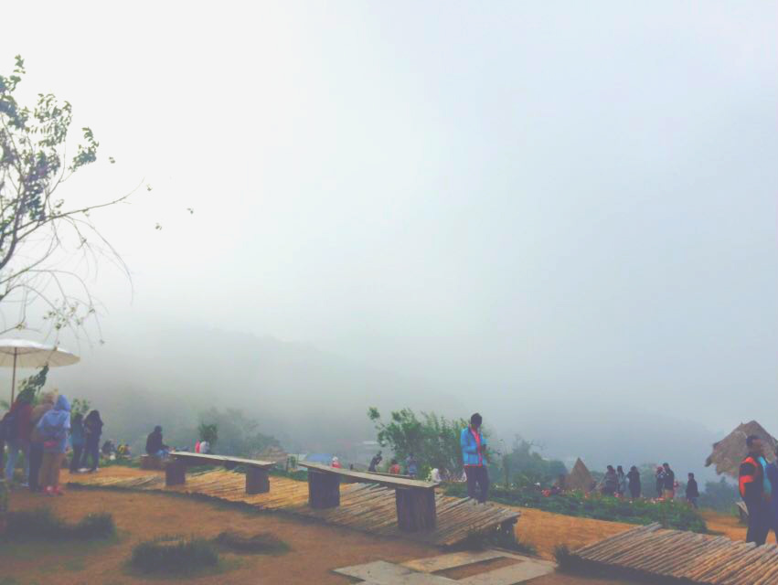 สภาพแวดล้อมบนม่อนแจ่มนี่ก็มีหมอกปกคลุมเย็นดีจัง ลมพัดจนหัวเหนียวเลยค่ะ นักท่องเที่ยวเยอะไปหน่อยวุ่นวาย หลบหามุมว่างๆ ถ่ายรูปยากมาก 5555