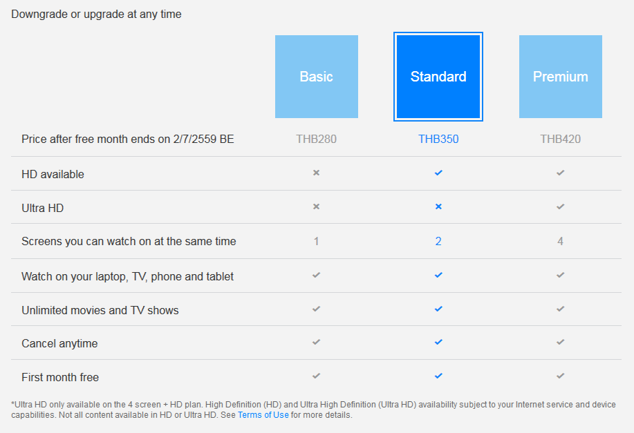 เดือนละ 350 บาท แบบมาตรฐาน ซึ่งผมว่าก็ควรจะเป็นอันนี้ เพราะแบบ basic นั้นไม่ได้ HD แต่ถ้าใครดู Netflix บนหน้าจอเล็กๆ อย่างพวกมือถือ/แท็บเล็ต ผมว่าแพลนนี้ก็โอเคอยู่ ความละเอียด 480p บนหน้าจอไม่ถึง 10" ก็น่าจะชัดเปรี๊ยะอยู่ เผลอๆ ให้จอคอมพ์ 20" ก็ยังดูโอเคเลยมั้ง