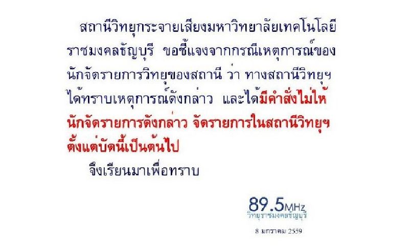 เมื่อวันที่ 8 มกราคม นายประเสริฐ ปิ่นปฐมรัฐ อธิการบดีมหาวิทยาลัยเทคโนโลยีราชมงคลธัญบุรี (มทร.ธัญบุรี) เปิดเผยว่า ขณะนี้ได้ออกคำสั่งให้ นายภัทรศักดิ์ เทียมประเสริฐ ออกจากการปฏิบัติหน้าที่ดีเจ คลื่น 89.5 เมกะเฮิร์ต วิทยุราชมงคลธัญบุรี ทั้งนี้รู้สึกเสียใจกับเหตุการณ์ที่เกิดขึ้น เนื่องจากนายภัทรศักดิ์มีพฤติกรรมที่ไม่เหมาะสม เพราะคลื่น 89.5 เมกะเฮิร์ต เป็นส่วนหนึ่งของหน่วยงานทางการศึกษาอีกด้วย