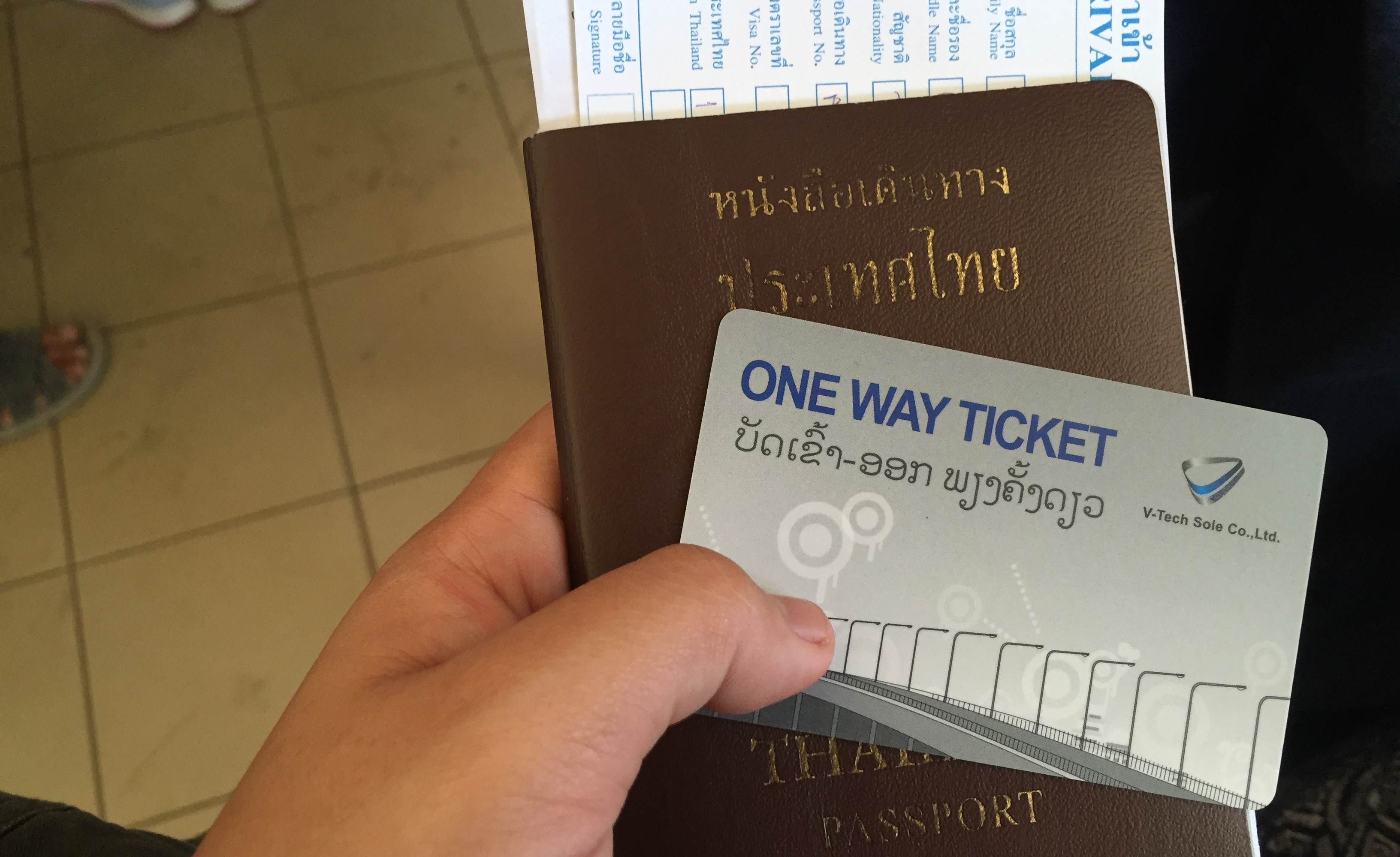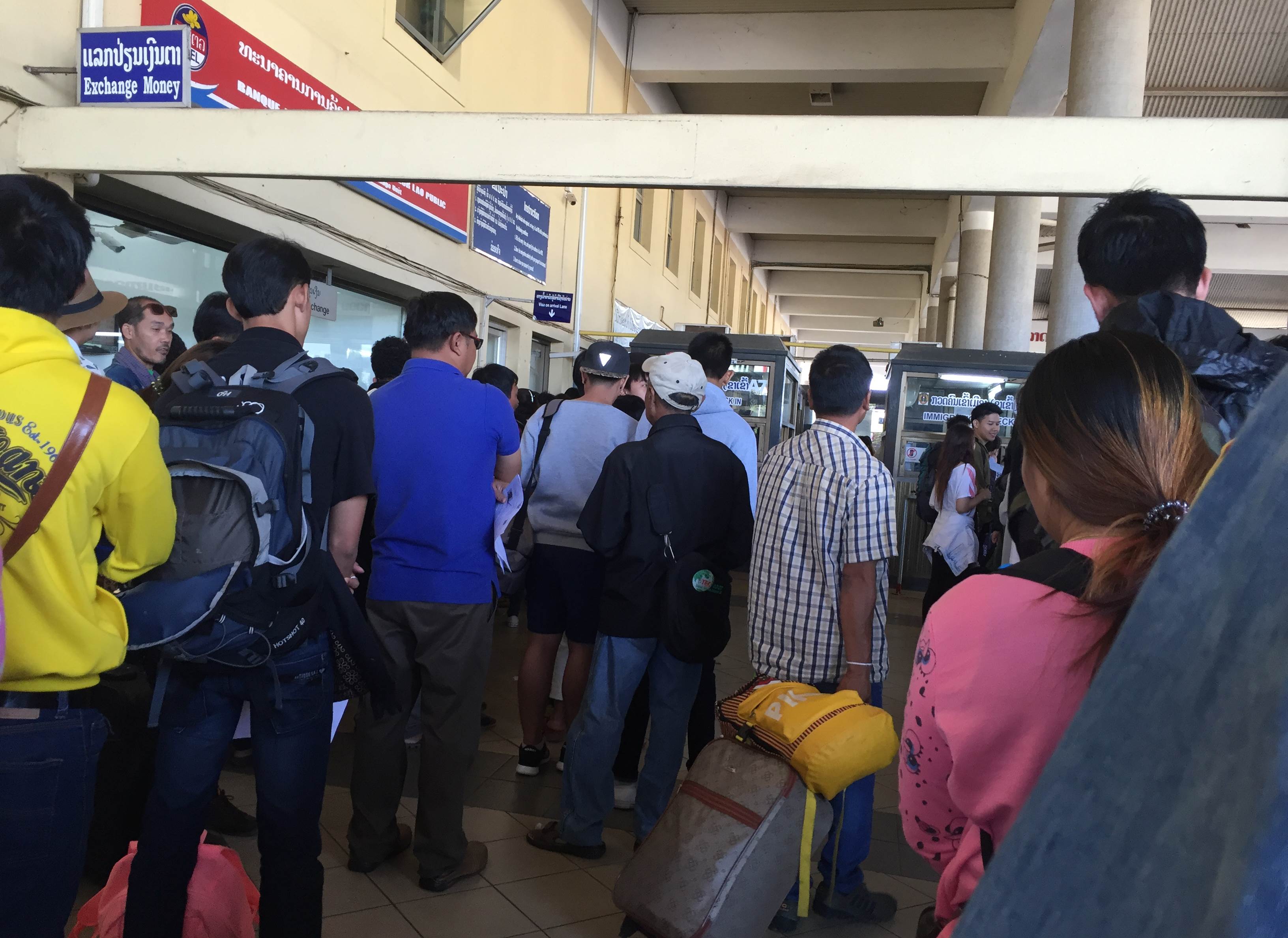 เมื่อรถวิ่งข้ามสะพานมิตรภาพไทย-ลาวมา ถึงด่านลาวก็ราวๆ 10.49น. เสียเวลากับการทำเรื่องเข้าประเทศไป 30นาที ที่นานเพราะคนเยอะค่ะ (ความจริงเค้าห้ามถ่ายรูปนะ นี่แอบถ่าย อิอิ) แต่ขาเข้าแล้วก็ขาออกที่ด่านลาวเนี้ยจะต้องเสียค่าธรรมเนียมนะคะ คือเราจะต้องไปซื้อบัตรอันนึงสีเทาๆที่ใช้ได้ครั้งเดียวสำหรับคนที่เดินทางไม่บ่อยอ่ะ(One Way Ticket) แต่ถ้าเป็นคนลาวเนี้ยเค้าจะใช้กันเป็นบัตรสีเขียวๆ ความจริงจะมีเวลาบอกนะคะว่าถ้าเวลาเท่านี้จะจ่ายค่าธรรมเนียมบัตรเท่านี้ ถ้าเกินนี้ก็จะเป็นอีกราคานึง แต่ปกติที่อาลีเคยมาเวียงจันทน์เนี้ยบางทีก็เสียบ้าง บางทีก็ไม่ได้เสียเลยงงเหมือนกัน ฮ่าๆๆ