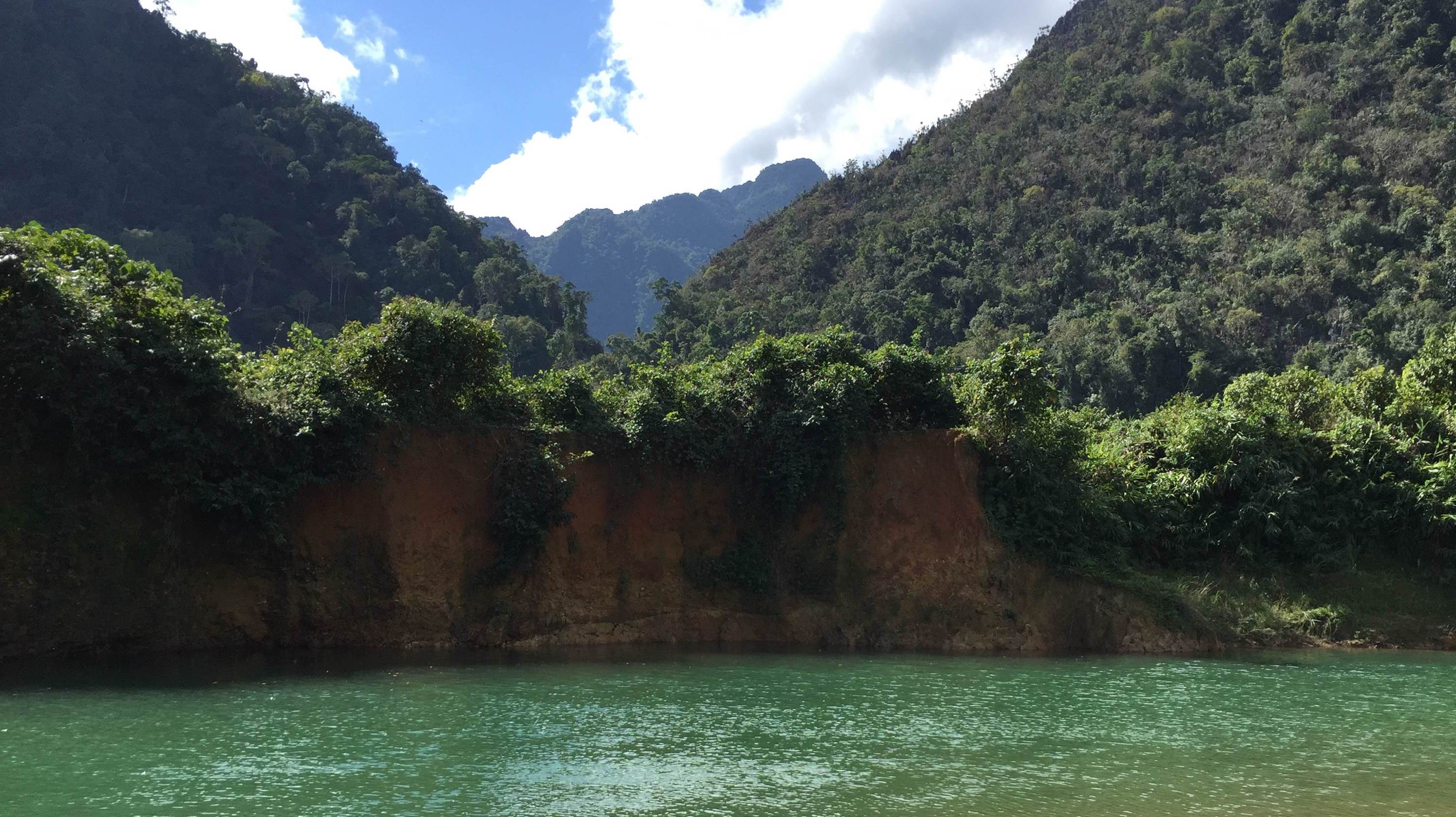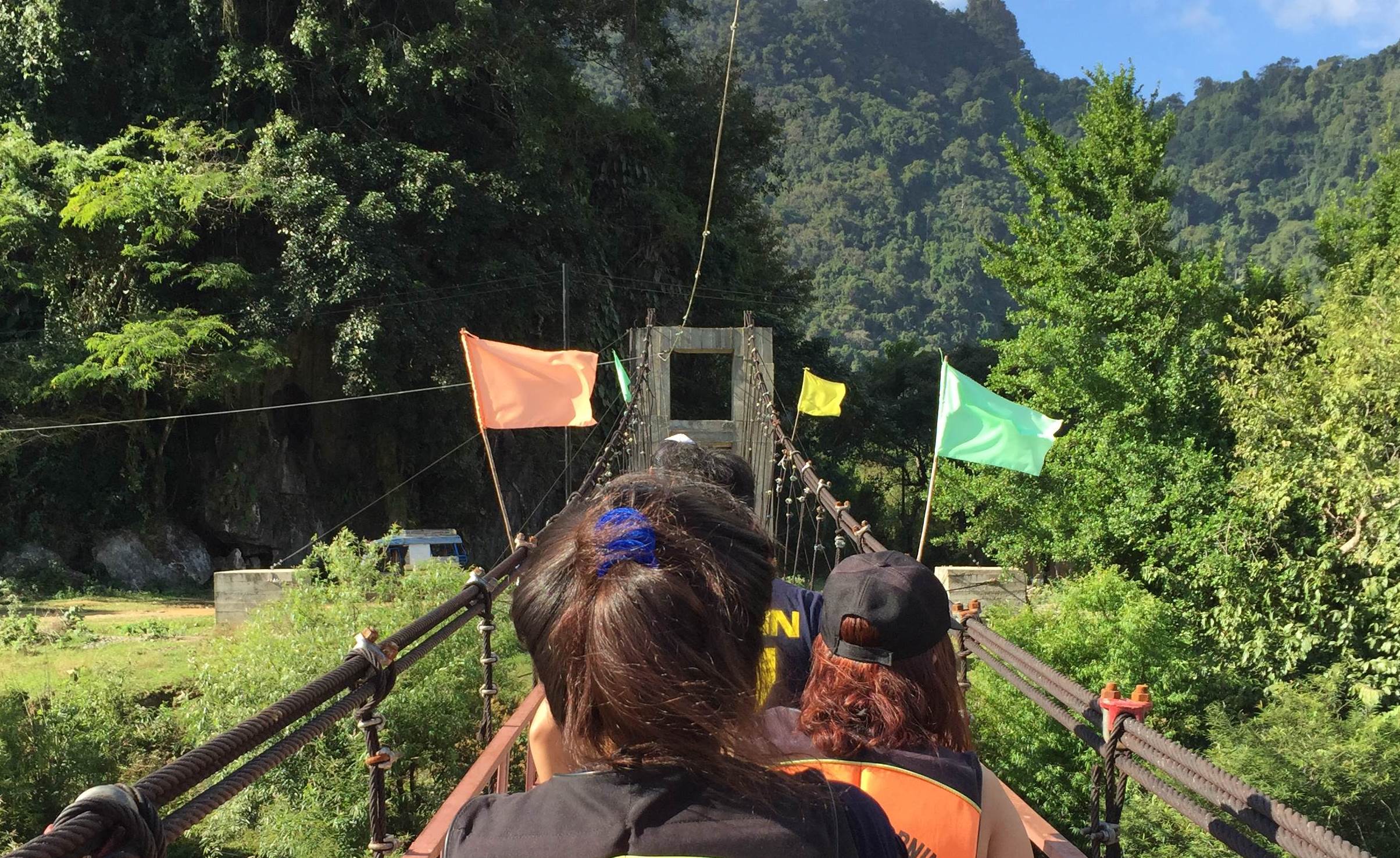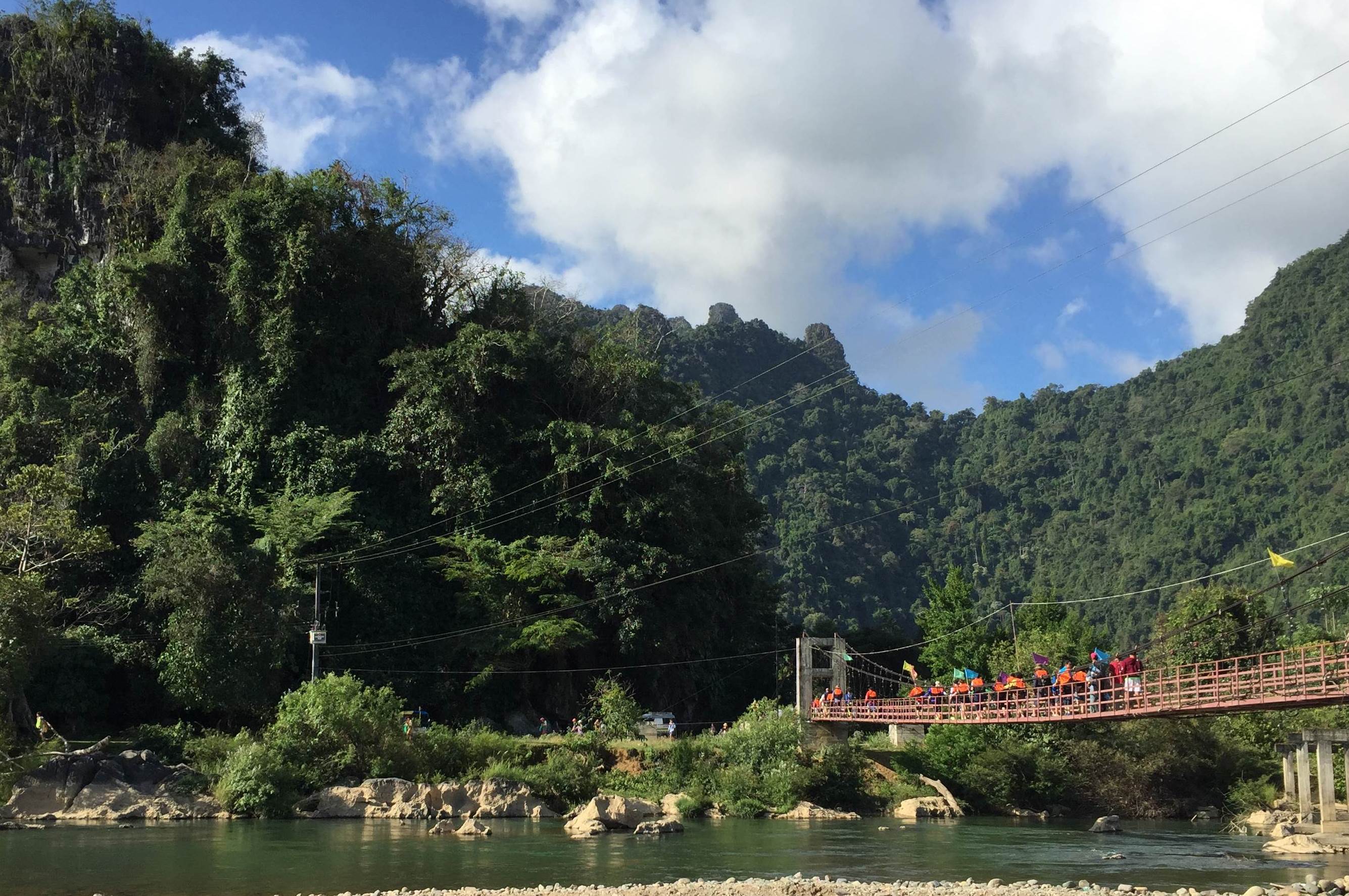 เพียงแค่คุณเดินข้ามสะพานโยกเยกนี้ไป ละเดินเท้าข้ามเขาไปประมาณ 2-3ลูก จะบ้าหรา!!ไม่ขนาดนั้นหรอก แต่เดินไปก็รู้สึกว่าไกลจริงๆแหละ ลมจับ! แวะไหว้พระ ที่ถ้ำช้างก่อนละกัน เป็นหินย้อยที่มีลักษณะเหมือนช้างอ่ะค่ะ ลืมถ่ายรูป... เดินๆๆไปอีก ถึงถ้ำน้ำ ต่อไปจะเป็นการนั่งห่วงยาง เอาก้นแช่น้ำเย็นๆ ย้ำว่าเย็นมากๆๆๆๆๆ แล้วเค้าจะมีไฟฉายใส่หัว แล้วภายในถ้ำจะมีเชือกให้เราสาวเข้าไป แล้วไอ้คนฝั่งขาออกเนี้ยก็แสบมากมีสาดน้ำใส่ขาเข้าด้วย คือน้ำมันเย็นมากไงคะ แล้วมาเจอแบบนี้อีก ตัวชาไปหมดแล้วววว ไอ้ที่อาบน้ำแต่งหน้าแบบจัดเต็มมาเมื่อเช้านี่ไปหมดละค่ะ ฮ่าๆๆ ท่องไว้ แอ๊ดเว๋นเจ่อ!! (ลืมถ่ายรูป)กว่าจะเข้าไปละออกมาก็เที่ยงพอดี อาหารเที่ยงก็ฝีมือน้องไกด์นั่นแหละ ผู้ชายด้วยนะ แต่เค้าทำข้าวผัดแล้วก็มีขนมปังให้อันนึง บาร์บีคิว 2ไม้ กล้วย กินเสร็จก็ขึ้นรถไปที่สองกันเลย..