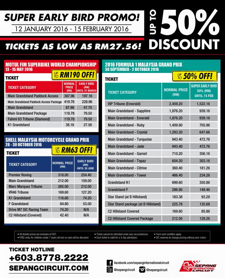 Sepang Circuit เปิดขายตั๋ว Early bird สำหรับ 3 events ปี 2016 แล้วค่ะ