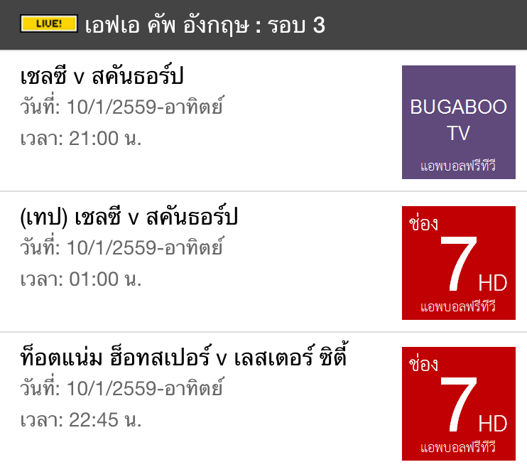 โปรแกรมฟุตบอลเอฟเอ คัพอังกฤษ คืนนี้ (10/1/59) ฟรีทีวีถ่ายทอดสด