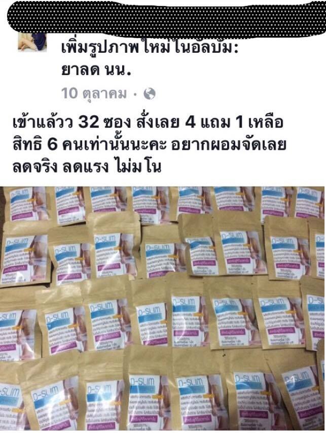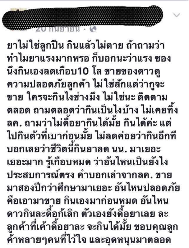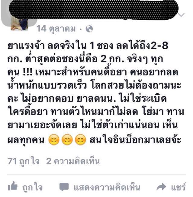 ที่ผมออกมาเขียนเพราะเหตุการณ์นี้เกิดขึ้นกับแฟนของผมเองครับได้ไปรู้จักกับยาลดน้ำหนักยี่ห้อนึงในIG เพียงเพราะ หลงเชื่อรีวิว (ซึ่งลืมคิดไปว่าสามารถเมคขึ้นมาได้) ความน่าเชื่อถือดูจากยอดฟอล (คิดผิดครับสมัยนี้สามารถปั้มยอดได้) อีกอย่างบวกกับการเห็นว่าราคาถูก เพียง 250 บาท /ซอง ใน 1 ซองมีเพียง 10 เม็ด สามารถกินได้เพียง 10 วัน ซึ่งถูกกว่ายาทั่วไปที่เหล่าดาราโฆษณาตามทีวี แฟนผมได้สั่งมาลองกินจำนวน 2 ซอง เชื่อไหมครับทานไปเพียงเวลา 2 วันเท่านั้นหยุดเลยครับผมสั่งหยุดเลย เนื่องจากมีอาการแน่นหน้าอกมาก นอนไม่หลับ ใจสั่น เหมือนคนที่กำลังออกกำลังกายอยู่ตลอดเวลา และคอแห้ง(แต่อาการคอแห้งกับยาลดน้ำหนักเป็นของคู่กันอยู่แล้วครับ) นี่ขนาดกินไปแค่เพียง 2 วัน แล้วถ้าขืนกินต่อไปเรื่อยๆผมไม่ทราบเลยว่าจะเกิดอะไรขึ้น ผมไม่มีเจตตนาที่จะประจารหรือใดๆทั้งสิ้น และไม่คิดเอาเรื่องน้องคนขาย เนื่องจากแฟนผมไม่ดีเองที่ไม่ดูให้ดีก่อน ไม่ถามก่อนว่ามี อย.ไหม? เพียงเพราะแม่ค้าบอกว่าเป็นยาสมุนไพรจีนไม่ใช่ยาลดสัดส่วน ไม่ใช่ยาชุด ซึ่งคำว่าสมุนไพรก็คงไม่มีอันตรายอะไรแต่เปล่าเลยครับ และบวกกับที่แม่ค้าบอกสรรพคุณว่า ใน1 ซองเนี่ยสามารถลดได้ 2-8 โล (เพียงเวลา 10 วัน) แต่สำหรับบางคนที่กินแล้วอาจจะลดจริงๆก็อาจจะมีครับแต่มันก็ไม่ทุกคน เพราะร่างกายคนเราต่างกัน
