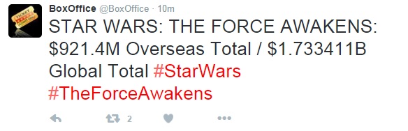 ด้วยตัวเลขรายได้รวมจากทั้งในอเมริกาและต่างประเทศจนถึงสุดสัปดาห์นี้ที่ $1,733.4M โดยประมาณ ทำให้ Star Wars: The Force Awakens ขยับขึ้นสู่อันดับ 3 บนตารางหนังทำเงินสูงสุดตลอดกาลแทน Jurassic World