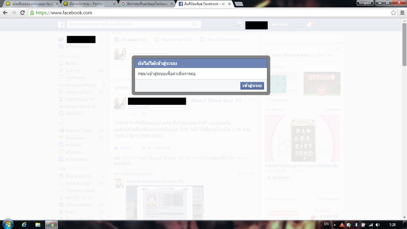 อาการก็คือประมาณว่ามันเหมือนผม logout ออกเฟสแล้ว แต่พอปิดคอมเปิดใหม่หรือเปลี่ยนเว๊ปอื่นๆ พอจะเข้าหน้า facebook มันก็ขึ้นเหมือนยังไม่ได้ logout แล้วขึ้นตามภาพตลอดเลยครับ ลองลบ chrome ลงใหม่ก็ไม่หายครับ รบกวนช่วยหน่อยครับ