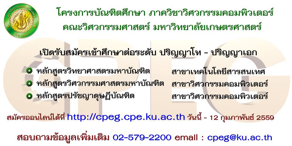 ป.โท เทคโนโลยีสารสนเทศ, ป.โท + ป.เอก วิศวกรรมคอมพิวเตอร์ ม.เกษตรศาสตร์ เปิดรับสมัครถึง 12 ก.พ. 2559