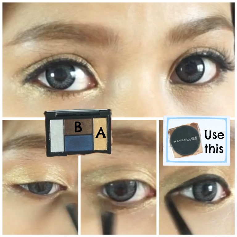 - เริ่มแรกทา Eye shadow สีทองให้ทั่วเปลือกตา และบริเวณถุงใต้ตา