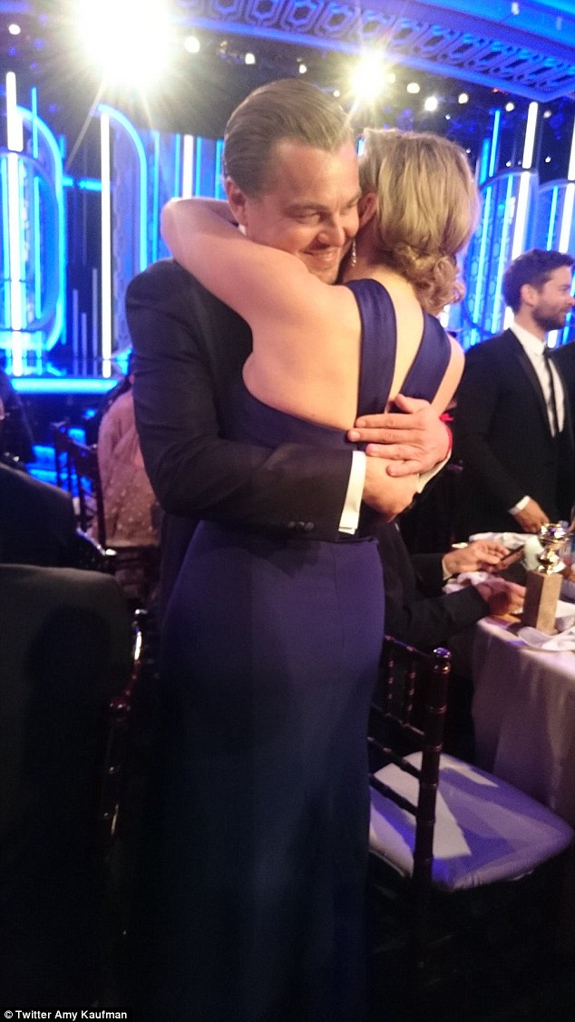 Kate is the first to give Leo a big hug!!! #titanic #GoldenGlobes