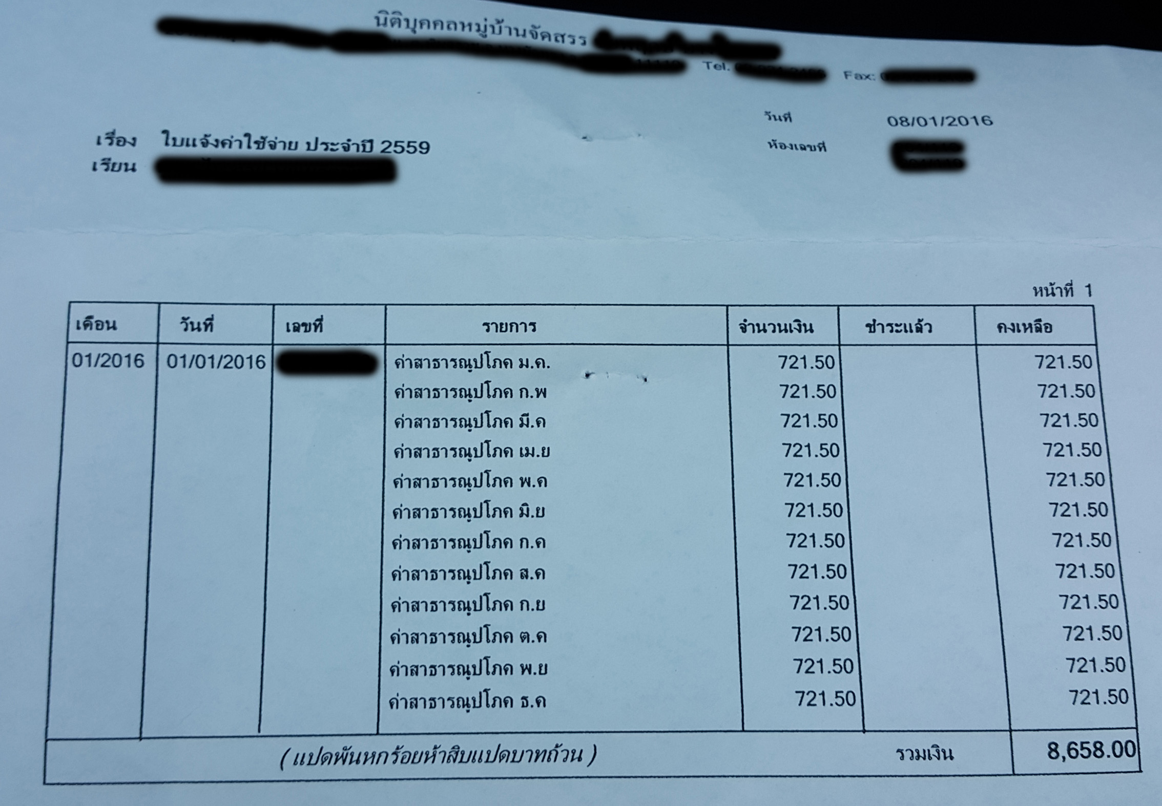 หมูบ้านเรียกเก็บค่าสาธารณูปโภคของปี 59 แล้วค่ะ 8,658.- เดือนละ 721.50 ของใครเสียเท่าไรบ้างคะ
