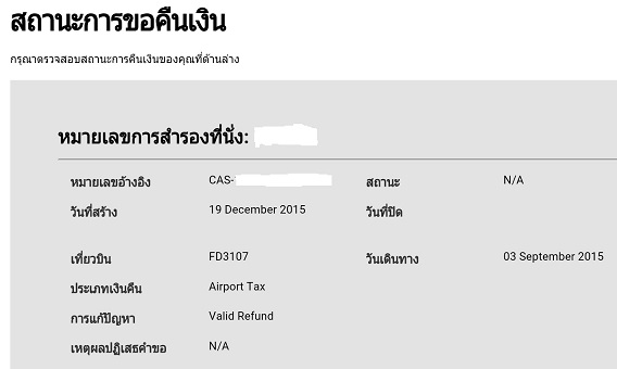 ได้จองตั๋วและไม่ได้เดินทางตามกำหนดการในการจองตั๋วโดยสารกับสายการบินหางแดง และได้ดำเนินการขอคืนภาษีสนามบินผ่าน e-form ไป 1 ครั้ง ต่อมาได้เข้าไปตรวจสถานะใน web ระบบแจ้งว่าไม่มีข้อมูลขอคืนภาษีสนามบินตาม