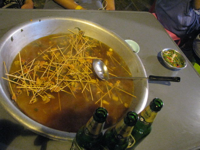 หมูจุ่มที่นี้เขาขายเป็นไม้คับไม้ละ 1 บาท.กินกับน้ำจิ้ม มี 2 รสชาติคับ มีน้ำจิ้มซีฟูดกับน้ำจิ้มคล้ายๆน้ำจิ้มสุกี้ กินไปจิบไปเรื่อยๆมันช่างมีความสุขซะนี้กะไร แถมมีเพื่อนแปลกหน้าที่ไม่ได้รู้จักพูดคุยกันสนุกสนาน มื้อนี้อย่าให้บอกว่าผมจัดไปกี่ไม้ลองดูจำนวนไม้เลยละกัน555