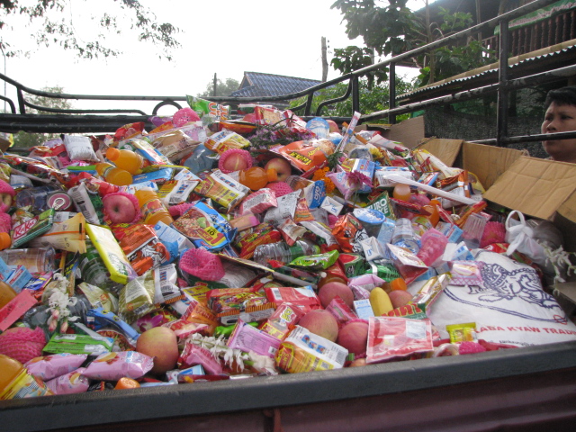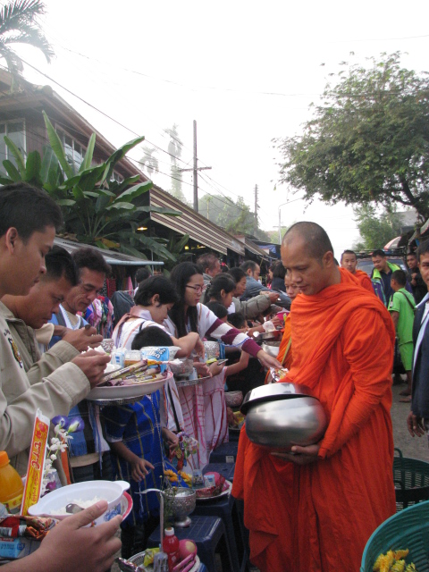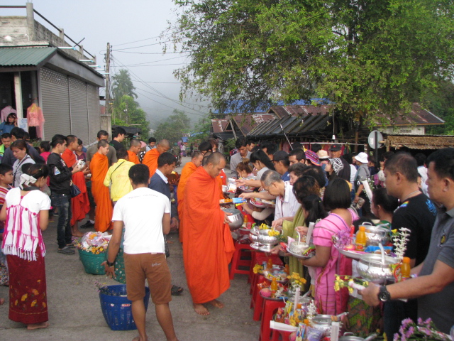ที่นี่เขาจะตักบาตรด้วยข้าวสวยคับ และอาหารแห้ง ส่วนอาหารที่กินกับข้าวสวยคนในหมู่บ้านจะปรุงและนำไปที่วัดอีกทีนึงคับ
