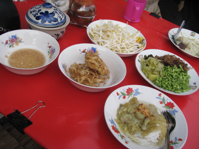 หลังจากอิ่มบุญกันแล้ว ก็หาอะไรกินอิ่มท้องกันดีกว่า จะกินอะรัยมื้อเช้าที่นี่ดี กินโจ๊กก็ดูเหมือนจะธรรมดาไป จัดขนมจีนแกงหยวก ของกินพื้นบ้านที่นี่ดีกว่า