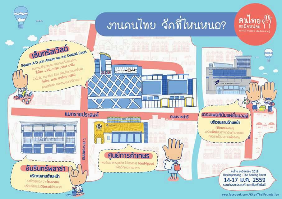 [Spoil] คลิกเพื่อดูข้อความที่ซ่อนไว้http://pantip.com/topic/34651250 งานนี้ไม่ได้เพิ่งจัดขึ้นครั้งแรก แต่จัดขึ้นเป็นปีที่ 3 แล้ว โดยบรรยากาศในงานจะเป็นเหมือนตลาดนัดที่ รวบรวมบูธของมูลนิธิอาสาสมัคร และภาคเอกชนในระดับประเทศจากหลายๆที่มาไว้ที่เดียวกัน บริเวณโดยรอบราชประสงค์และลานหน้าห้างเซ็นทรัลเวิลด์ค่ะ วันหยุดนี้ถ้าไม่รู้จะไปไหนก็มาเดินเล่นเพลินๆ แถมได้บุญกลับบ้านด้วยนะคะ