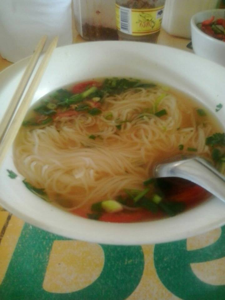 พาอิ๋วเดินลงไปกินข้าว กับเฝอชามแรก สำหรับคนไม่กินเนื้อ ใส่แต่เส้นกับมะเขือเทศ แอบตกใจเล็กๆ
