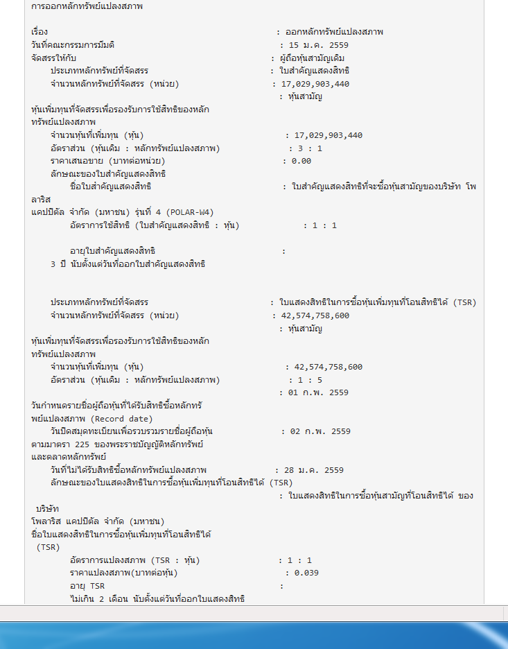 (๑) แจก polar-tsr อายุ 2 เดือน ขายหุ้นใหม่เพิ่มทุนราคา 0.039 บาทต่อ 1 polar ดูเผินๆขายได้ราคาต่ำกว่า แต่ความเป็นจริง 1 polar ได้รับ 5 polar-tsr ซื้อหุ้นใหม่ 1 polar-tsr : 1 polar ราคา 0.39 รวมกันแล้วต้องจ่าย 0.039*5 = 0.195 บาท ต่อ 1 polar ที่ได้สิทธิ สูงกว่าราคาในกระดาน 0.09 ชั่งแยบยล เจ้าเล่ห์ คิดได้แสบๆเหลือรับประทาน