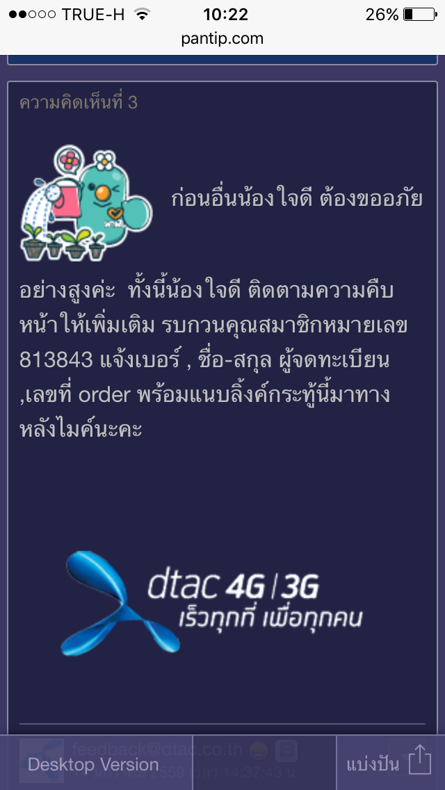 ตั้งกระทู้ complain บริการของDTAC เมื่อวันที่ 14 มกราเวลาประมาณ 14.0น. ตามlink นี้ครับ