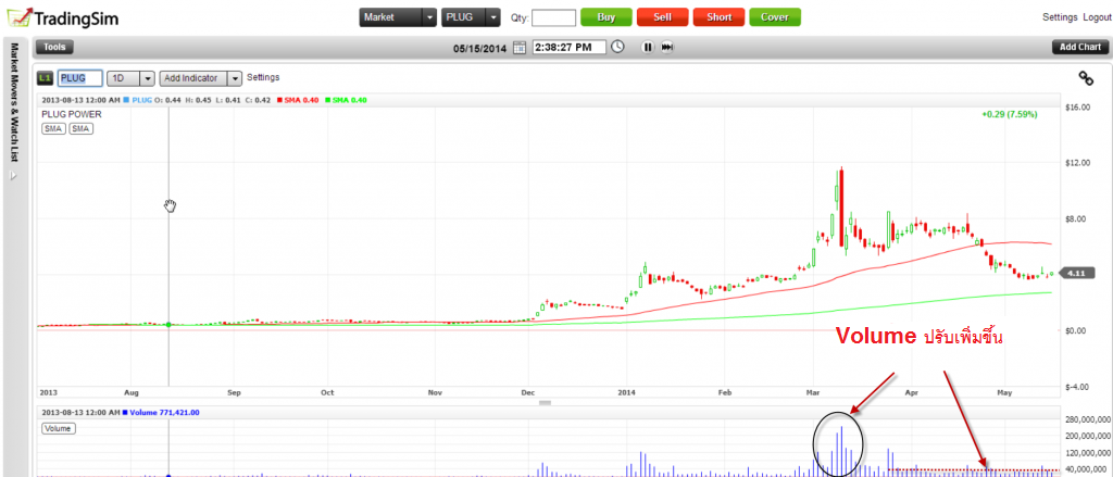 ลองมาดูตัวอย่างหุ้น PLUG ที่มี Volume ที่สร้างความสับสนในแต่ละวัน อย่างที่สังเกตเห็นได้ว่า Volume ในแต่ละวันมีการปรับตัวเพิ่มขึ้นแล้วราคาก็ปรับตัวลดลงถึง $ 3-4