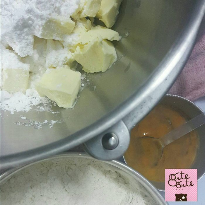 เริ่มจาก ทำคุกกี้น้ำตาล โดยมีส่วนผสมดังนี้