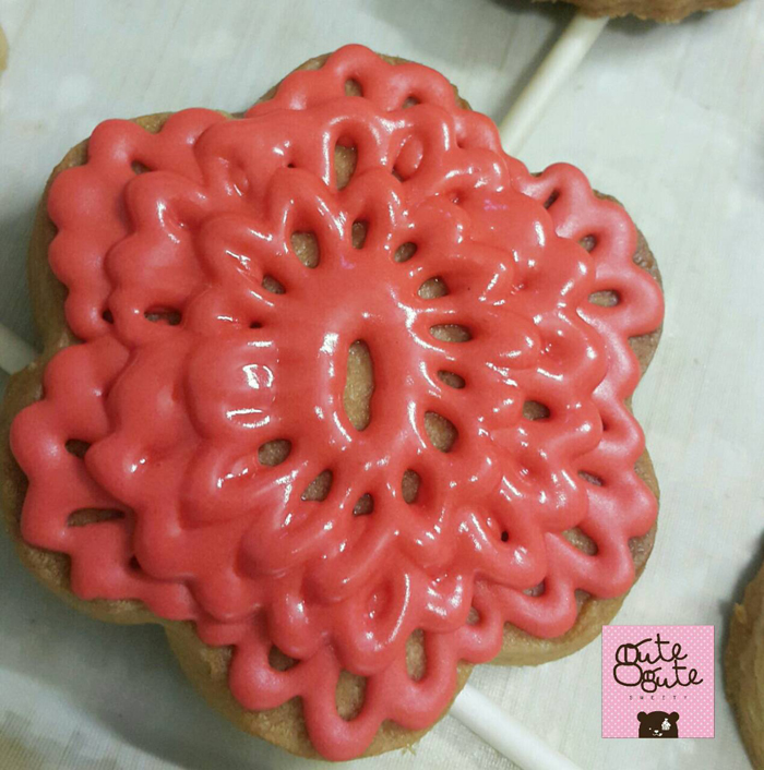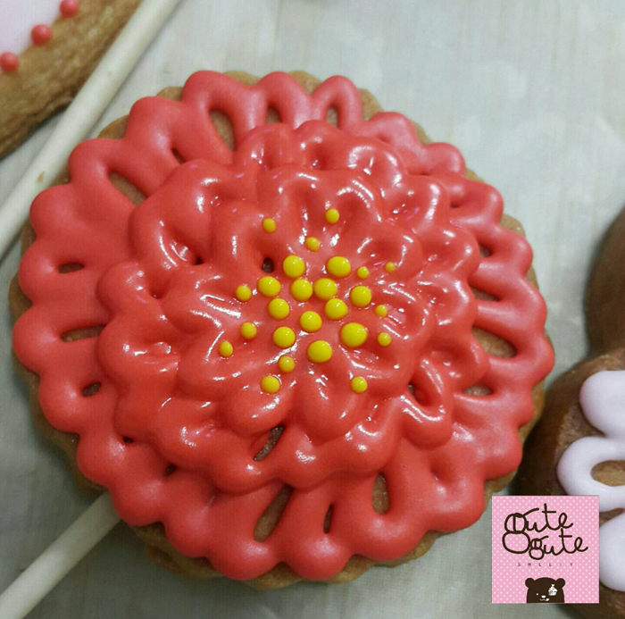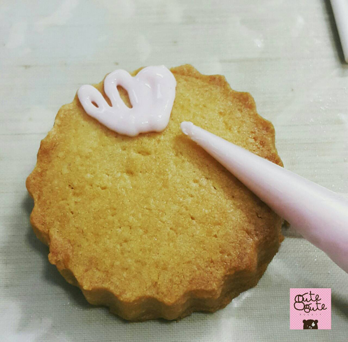 8. นำรอยัลไอซิ่งที่เตรียมไว้เทใส่กรวย ตัดปลายแล้วนำมาวาดลงบนคุกกี้ตามรูป วาดบนครบรอบแล้วพักไว้ให้รอยัลไอซิ่งแข็งตัว แล้วจึงวาดรอบใหม่ ไม่เช่นนั้นรอยัลไอซิ่งอาจผสมไหลรวมกันได้ค่ะ ในรูปนี้เราผสมรอยัลไอซิ่งเหลวไปนิดนึงนะคะ กลีบดอกเลยไม่สวยเท่าไหร่ .... พลาดอีกละ -*-