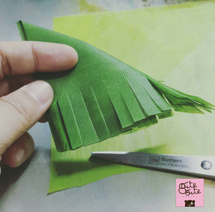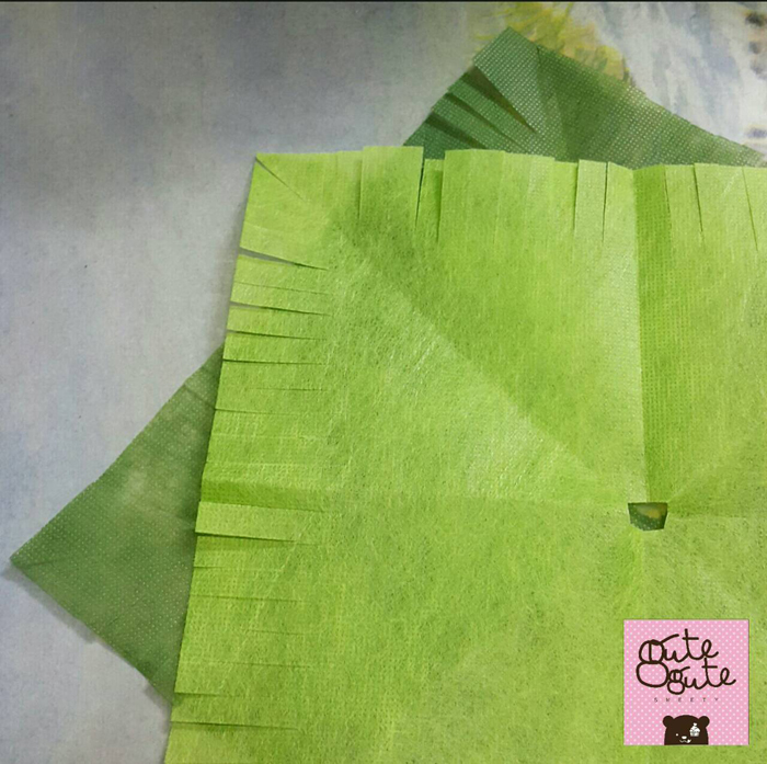 2. พับทบๆให้เป็นสามเหลี่ยม แล้วตัดให้เป็นเส้นๆตามรูป