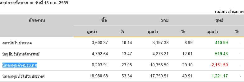 Sinthorn Summary 18/1/2559 : ต่างชาติขายสุทธิ -2,151.59 ลบ.