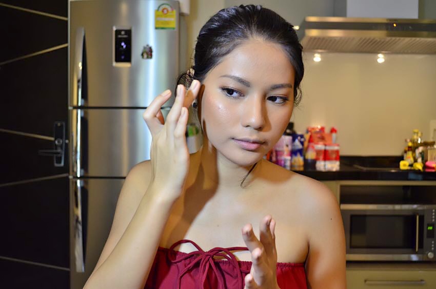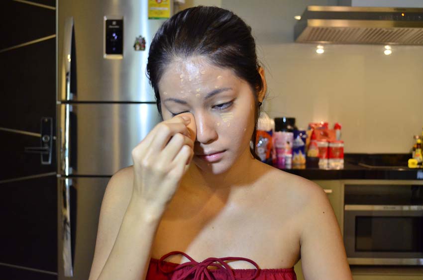 บริเวณกว้างเช่นใต้ตา อายตาใช้ฟองน้ำเกลี่ยค่ะ แต่ถ้ากลบสิวเม็ดจิ๋วๆ จะใช้นิ้วนางเกลี่ยแล้วค่อยฟองน้ำแตะๆตามเบาๆ