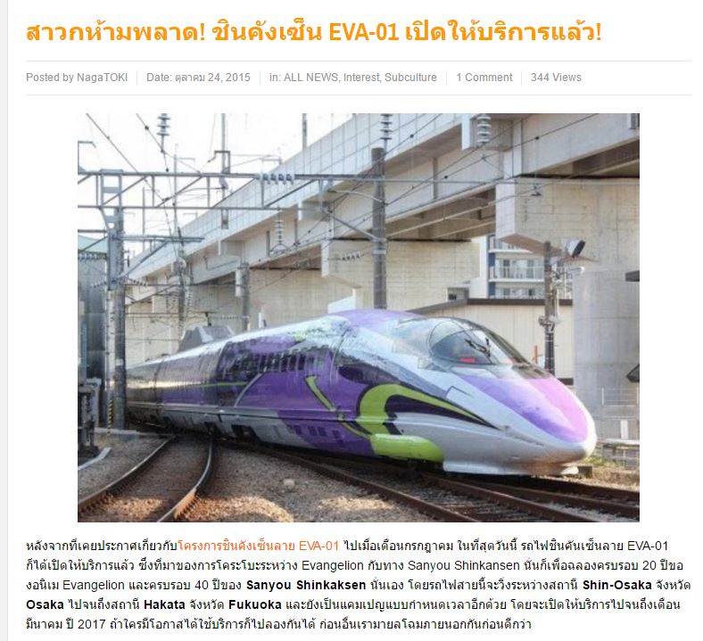 สวัสดีครับ เมื่อประมาณสามเดือนที่แล้ว ได้ข่าวจากเว็บ Akibatan ว่า Sanyo Shinkansen ที่วิ่งระหว่าง สถานี Shin-Osaka กับ สถานี Hakata ตกแต่งเป็นธีม Evangelion แต่น่าเสียดายที่ถ้าจะขึ้นรถไฟสายนี้ต้องซื้อ JR Pass ใบใหญ่ หรือ Sanyo Area แทน ซึ่งไม่เหมาะกับแผนการท่องเที่ยวของผม จึงต้องตัดใจและไปกินเค้กที่ EVA Cafe แทน (ฮา) ใครที่สนใจติดตามได้ที่ link ด้านล่างเลยครับ