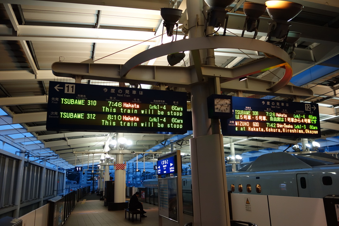 ขบวนที่นั่งชื่อ Tsubame เป็นขบวนหวานเย็น จอดทุกสถานีแต่ช้ากว่าขบวน Sakura ไม่เกินยี่สิบนาที (จากคุมาโมโต้ ไป ฮากาตะ)