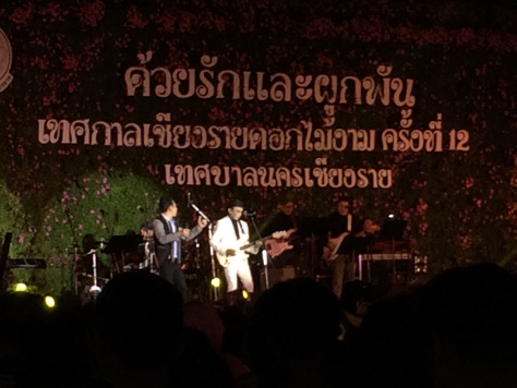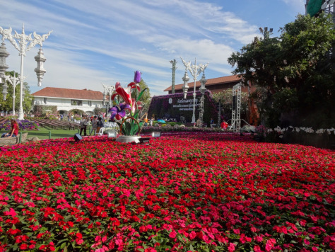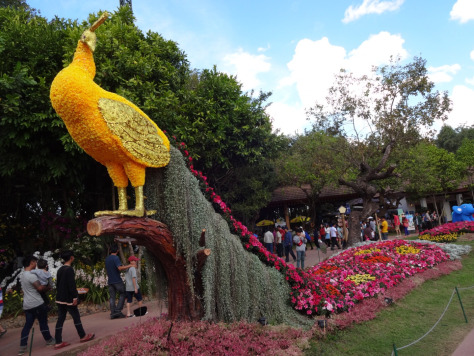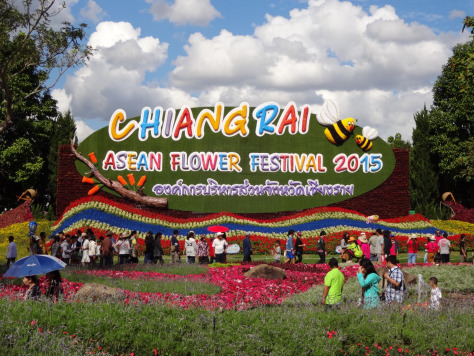 ที่พักมีมอเตอร์ไซค์ให้เช่า เราก็ตกลงเช่าในราคา 150 บาท (ปกติ 180 บาท) พอถามทางที่เราจะไปแล้วก็ออกเดินทางกันเลย จุดแรกเป็นสวนดอกไม้ริมกก มีการจัดงานดอกไม้อาเซียน ขี่ตามรถอื่นไปยังไงก็ไม่หลง ที่จอดรถมีทั้งฟรีและเสียเงิน แต่เราพลาดไม่รู้ว่ามีฟรีก็เสียค่าจอด 30 บาท เดินจากจุดจอดไปจุดจัดงานไกลและร้อนมาก พอถึงงานคนก็เยอะมากๆ ตามปริมาณรถที่มา