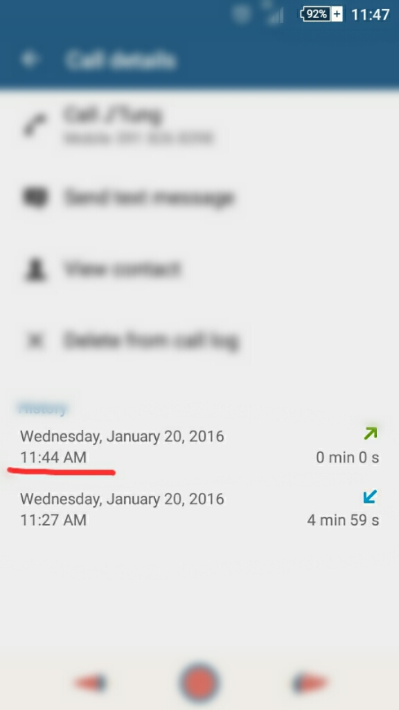 รูปนี้คือรายละเอียดของที่โทรเข้า-ออก จะเห็นได้ว่าที่มีชื่อในcall log เพราะโทรเข้า1 ครั้ง เราโทรออก1 ครั้งแต่ยังไม่ได้คุย