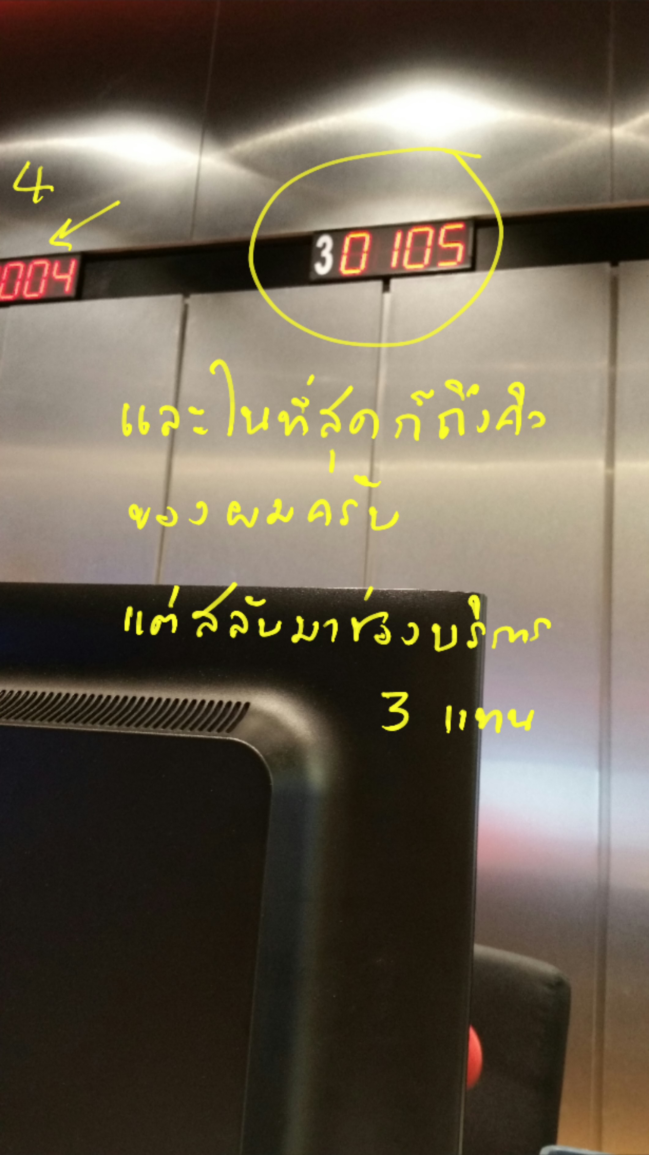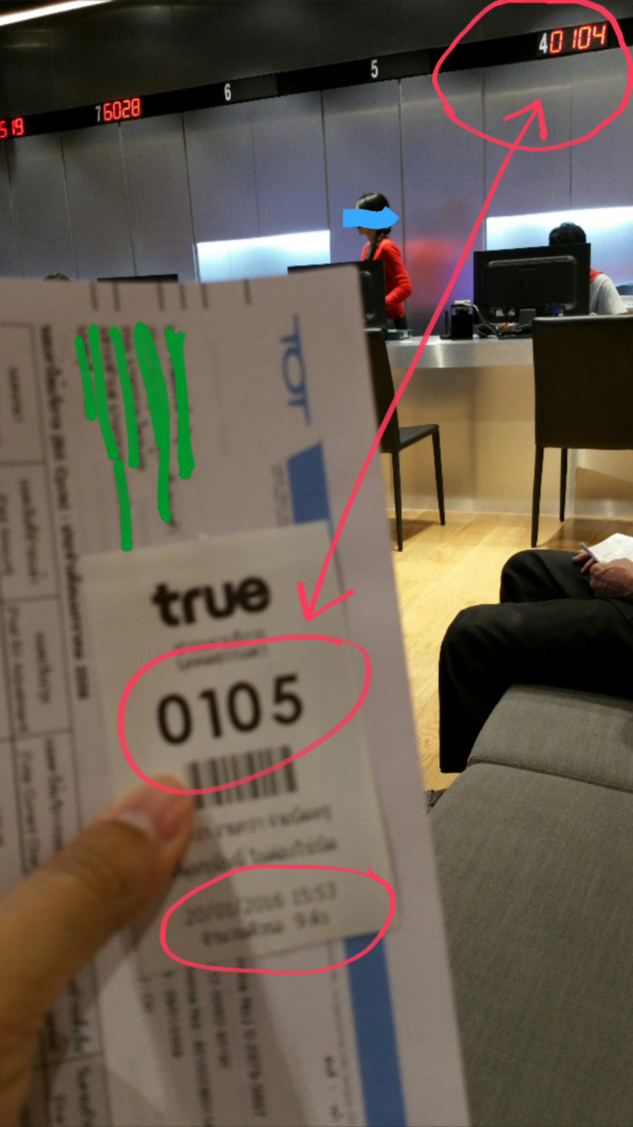 ก็ได้บัตรคิวมาหมายเลข 0105 ครับ หันไปมองดูหมายเลขที่ช่องบริการที่ 4 มีขิ้นตัวเลข 0104 ผมก็คิดว่าไม่เห็นจะนานเลย แค่คิวเดียว (สาขานี้เพิ่งรีโนเวทใหม่ มีถึง18ช่องบริการ)