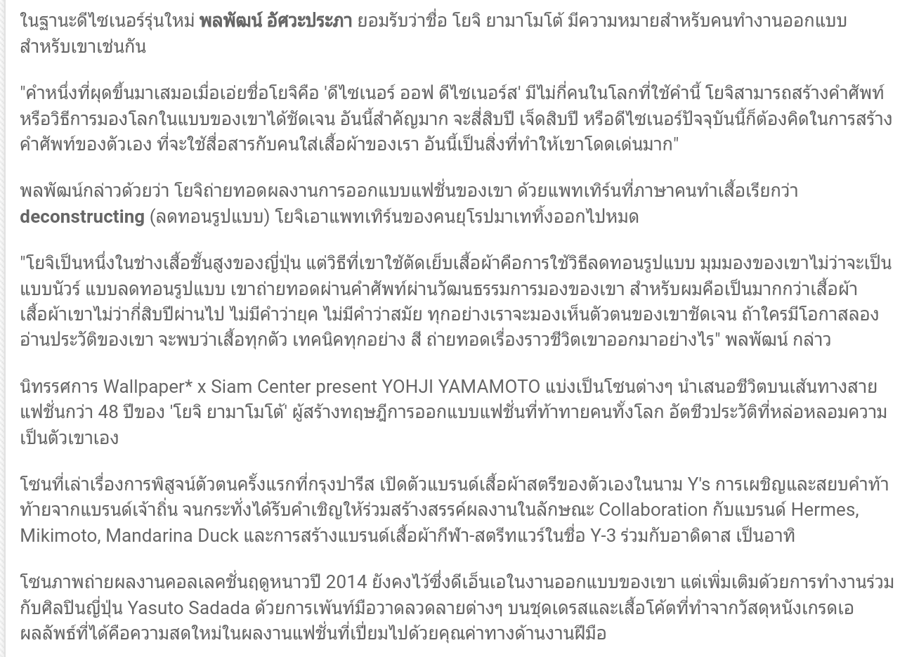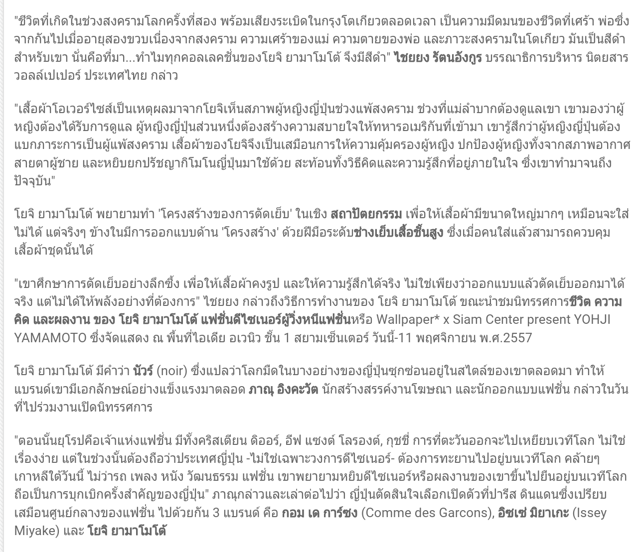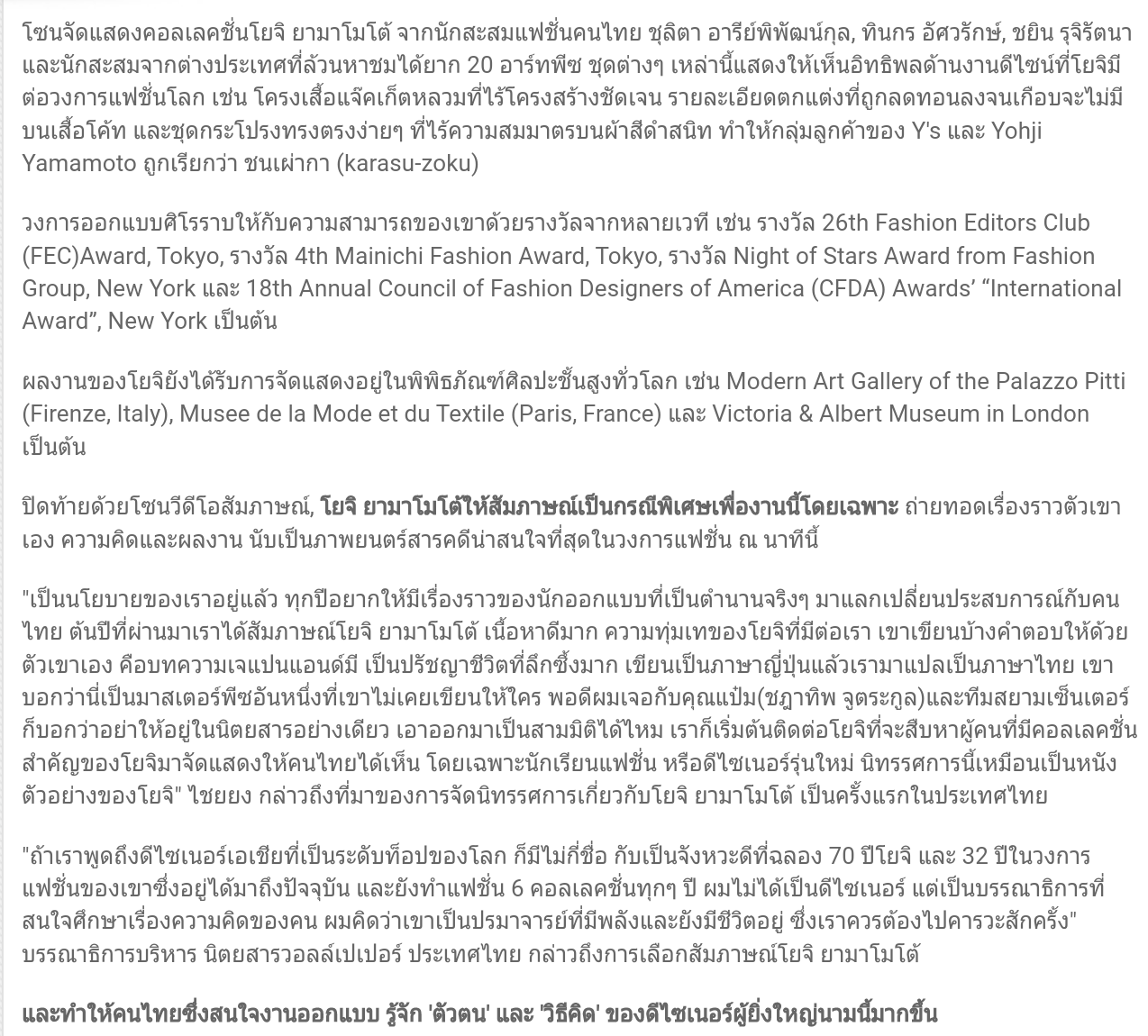 ดีไซเนอร์ไทยยกย่อง โยจิ ยามาโมโต้ ผู้สร้างปรากฏการณ์ใหม่ ให้วงการแฟชั่นโลก http://www.thairath.co.th/content/460817