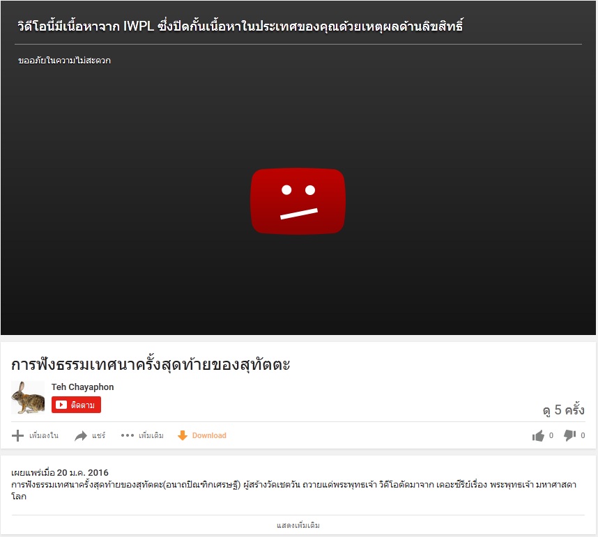 เรื่องก็มีอยู่ว่าผมได้ดูซีรีย์เรื่อง "พระพุทธเจ้ามหาศาสดาโลก" และมีหลายๆตอนที่ประพุทธเจ้าเทศนาธรรมแล้วมันโดนใจผมเข้า มีอยู่ตอนหนึ่งที่ผมอยากจะตัดเอาธรรมเทศนาที่เป็นพุทธพจน์สั้นๆ ประมาน 5นาที ที่พระพุทธเจ้าพูดกับ สุทัตตะ ก่อนจะสิ้นใจ โดยผมตั้งชื่อมันว่าการฟังธรรมเทศนาครั้งสุดท้ายของสุทัตตะ โดยอัพโหลดลง youtube แต่เมื่อให้คนอื่นกดลิ้งค์เข้าไปดูกลับโดน youtube block และแจ้งว่า "วิดีโอนี้มีเนื้อหาจาก IWPL ซึ่งปิดกั้นเนื้อหาในประเทศของคุณด้วยเหตุผลด้านลิขสิทธิ์ "