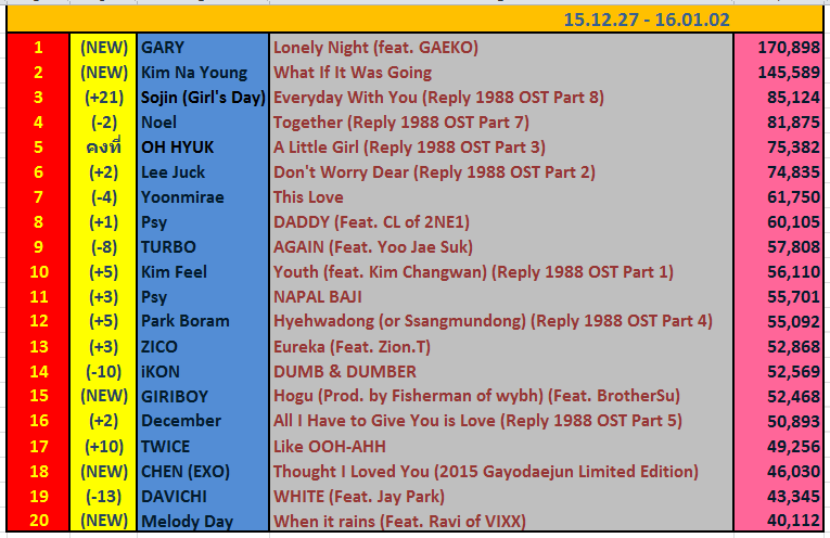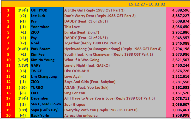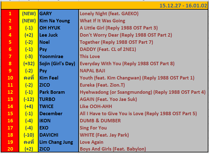 [K-POP] TOP20 Gaon Chart ประจำสัปดาห์ที่ 1-3 เดือนมกราคม 2016