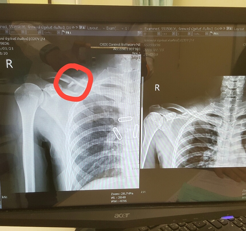 คือกระดูกไหปลาร้าหักเพราะรถจักรยานล้ม หมอก็ให้ใส่สายรัดยึดไหล่ไว้ ตอนแรกกระดูกส่วนนั้นยังคงติดกันแต่พอผ่านไปสองสัปดาห์หมอนัดมาตรวจอีกครั้งก็เจอว่ามันห่างกัน มัน