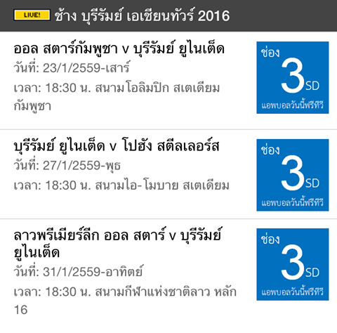 ฟุตบอล ช้าง บุรีรัมย์ เอเชียนทัวร์ 2016 ฟรีทีวีถ่ายทอดสด ห้ามพลาด