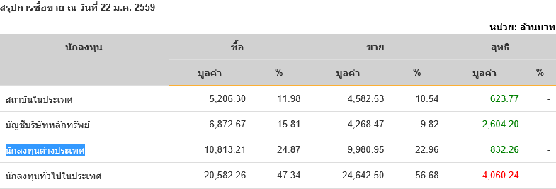 Sinthorn Summary 22/1/2559 : ต่างชาติซื้อสุทธิ 832.26 ลบ.