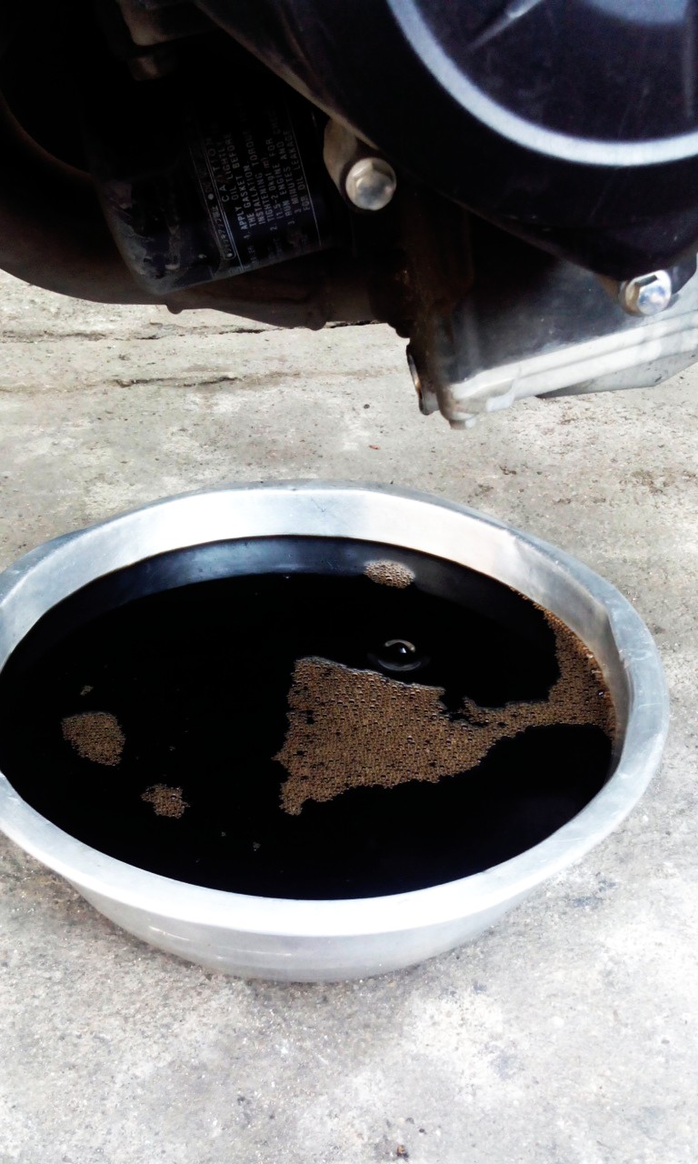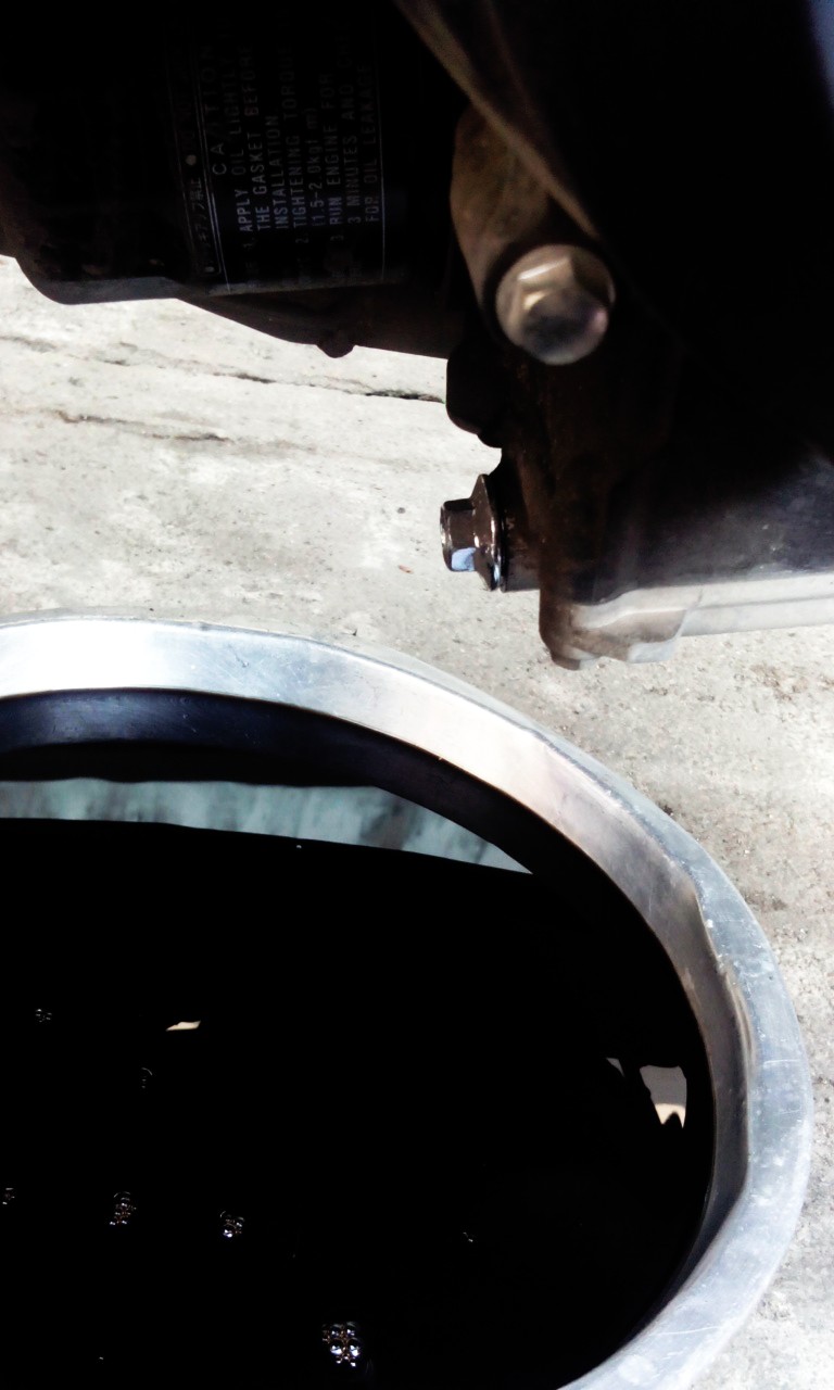 พอรอสักครู่ น้ำมันเครื่องเริ่มไหลเป็นหยดๆ ก็ปิดน็อตได้เลยครับ เพราะถึงเราจะรอให้หยุดไหล มันก็จะยังมีน้ำมันเครื่องค้างอยู่ที่กรองน้ำมันเครื่องเก่าของเราอยู่ดี เพราะผมไม่ได้เปลี่ยนตัวกรองด้วย
