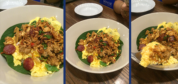 ข้าวไข่นุ่มกะเพราหมูยอกุนเชียง รสชาติดีเหมือนเดิม เสิร์ฟบนใบตอง ให้มีกลิ่นอ่อนๆ ติดใจตรงไข่นุ่มมาเป็นไข่เจียวแต่นุ่มจริงๆ คือเนื้อก็แน่น แต่ก็เบาเหมือนกัน ภาษาอังกฤษเขียนว่า Lava omelette แต่ก็ไม่ได้ถึงกับลาวาอะ คือยังเป็นรูปร่างกว่าข้าวไข่ข้นของบ้านหญิงน่ะ โอ้ยยยย..อธิบายลำบากมาก ต้องมาลองทานเอง (165 THB)