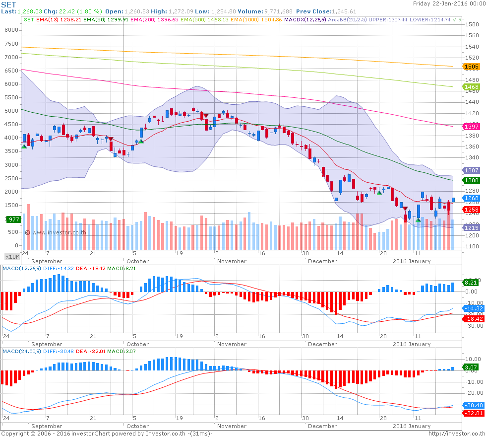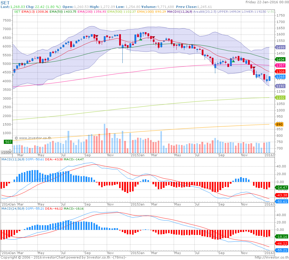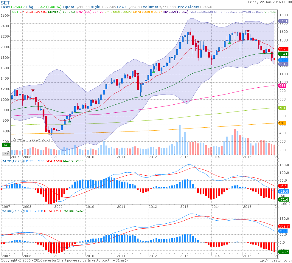 จะเห็นว่ากำลังเกิด morning star pattern ในระดับวีคขึ้นแล้ว ซึ่งยังไม่ยืนยันการเกิดขึ้นของรูปแบบเพราะอะไรนะหรือ เพราะดัชนีราคายังอยู่ต่ำกว่าเส้น ema กับ macd ยังไม่ confirm ยังไงหล่ะครับ