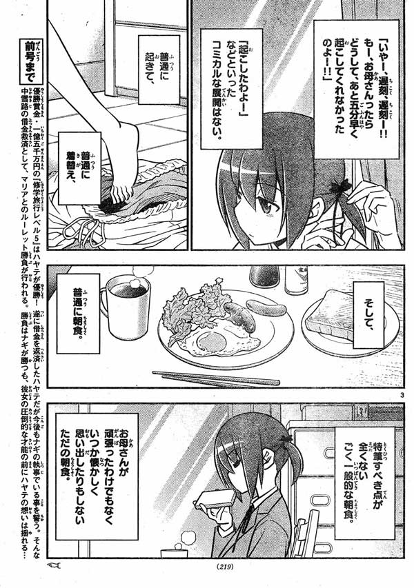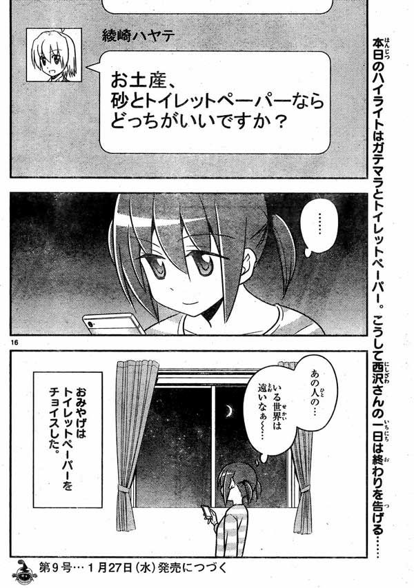 หลังจากตอบกลับไปแป๊บเดียวฮายาเตะก็ตอบกลับมาหลักจากที่ทักทายมา จริงๆคือฮายาเตะมีคำถามเร่งด่วนอยากจะถามอายุมุ อายุมุเลยรีบถามว่าคืออะไรด้วยความตื่นเต้น และคำถามก็คือ..... "อยากได้ทรายหรือกระดาษชำระเป็นของฝากดีครับ" ความตื่นเต้นของอายุมุหายไปในทันที ได้แต่คิดว่าฮายาเตะนั้นคงอยู่ในโลกที่ห่างไกลจริงๆ แล้วก็ตอบขอกระดาษชำระไป