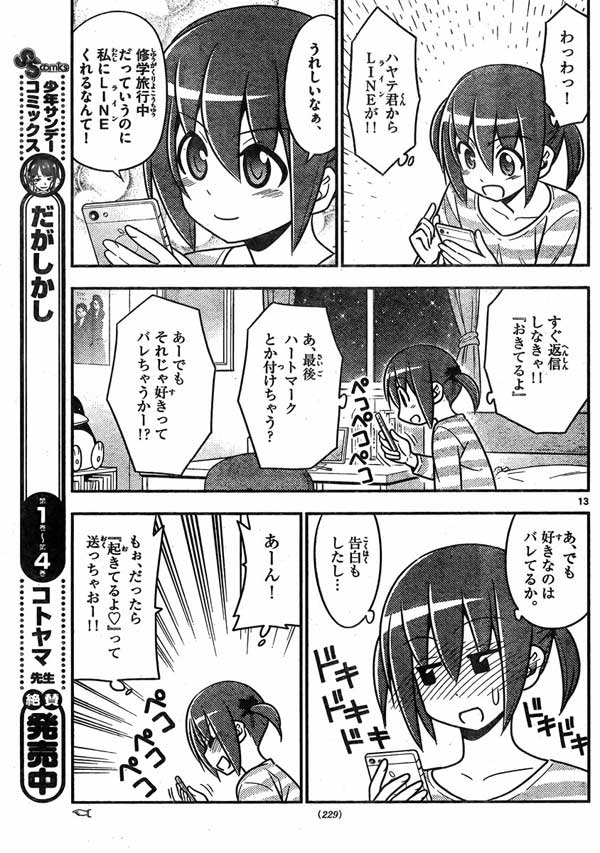 แต่ในวันนี้ก่อนจะได้นอน จู่ๆฮายาเตะ LINE มาหาเธอ ทำเอาเธอรีบลุกขึ้นมาอ่านทันทีด้วยความตื่นเต้น มีความสุขที่ต่อให้ฮายาเตะกำลังทัศนศึกษาแต่ก็ยังติดต่อมาหาเธอ เธอจึงคิดว่ารีบตอบกลับไปทันทีดีกว่า คิดว่าจะใส่ไอคอนหัวใจด้วยดีไหมแต่ก็คิดอีกว่าแบบนั้นเดียวจะรู้ว่าชอบอยู่เลยลังเล แต่ก็พึ่งนึกได้ว่าตัวเองสารภาพรักไปแล้วนิ ก็เลยไม่สนใจแล้วตอบกลับพร้อมไอคอนรูปหัวใจไปเลยด้วยความตื่นเต้น